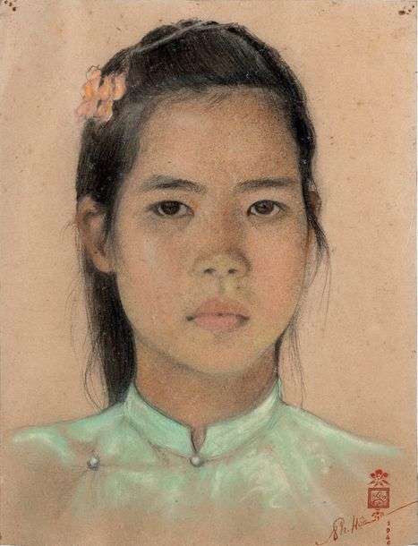 Habituellement plus enclin à peindre des paysages, il nous livre ici le portrait doux et subtil de sa propre fille. Son travail y est minutieux, les tons clairs accentuent la féminité et la douceur du portrait. La délicatesse de son travail sur les cheveux, leur mouvement et leur finesse naturelle est toute particulière. Le nacré du vêtement fait ressortir à merveille la beauté de la jeune fille. La subtilité de cette oeuvre est un véritable exemple de la finesse artistique et du sens du détail de Pham Hau.
