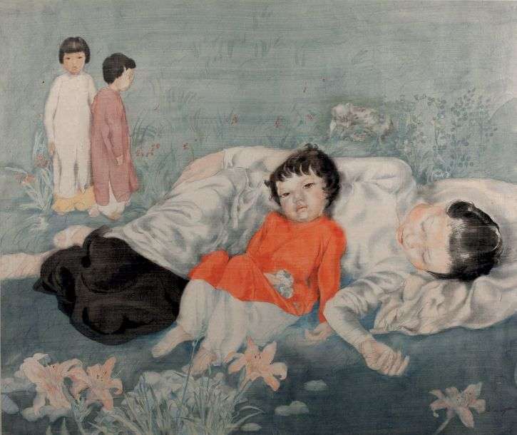 Alix Aymé fait de cette oeuvre une merveilleuse maternité par la posture de l’enfant couché sur le ventre de sa mère, les lys en premier plan, symbole de fécondité, la posture alanguie mais protectrice de la mère dont les genoux sont repliés contre l’enfant…