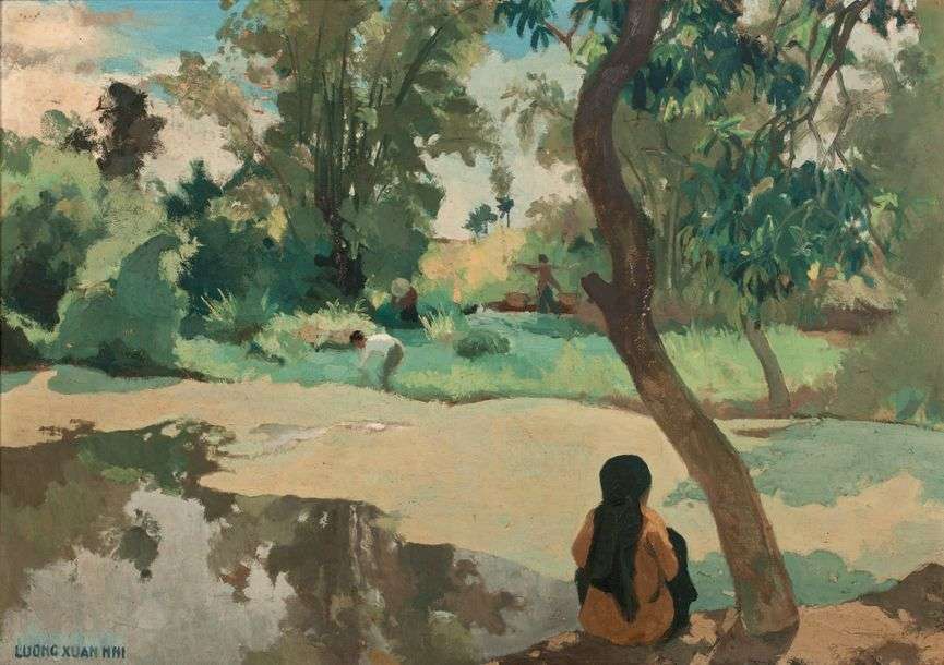 Dans le traitement esthétique de ce paysage, Luong Xuan Nhi se nourrit de sa connaissance de l’art moderne occidental et en particulier de l’oeuvre de Gauguin. D’abord grâce à l’utilisation de l’huile par grands aplats de couleurs mais aussi dans la thématique représentée. Celle de la nature verdoyante et riche et celle de la simplicité du quotidien sublimé. Comme Paul Gauguin avec ses représentations de la Bretagne puis de la Polynésie, Luong Xuan Nhi cherche à montrer le Vietnam, sa terre natale et adorée, comme un lieu de paix, un nouvel Eden.