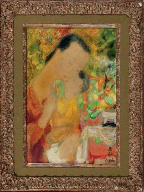 Le Pho, son of the last Viceroy of Tonkin, was born into a family of mandarins in 1907. He was one of the first intake of students at the Hanoi Fine Arts School, where he studied with Victor Tardieu and was taken under his wing in view of his remarkable talents. This piece is highly representative of his work and the way he synthesised Chinese, Vietnamese and Western art. The theme of mothers and children was very common in his work, because it enabled him to relate to the history of Western art, echoing the religious theme of the Madonna and Child, while highlighting Asian artistic techniques.