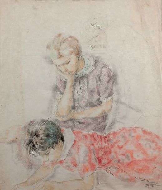 and the artist brilliantly captured these tender, fleeting moments of childhood through her virtuosic drawing and watercolour skills. Alix Aymé makes use of her considerable talent as a portraitist in this piece, drawing the viewer into the intimate world and imagination of these highly focused children.