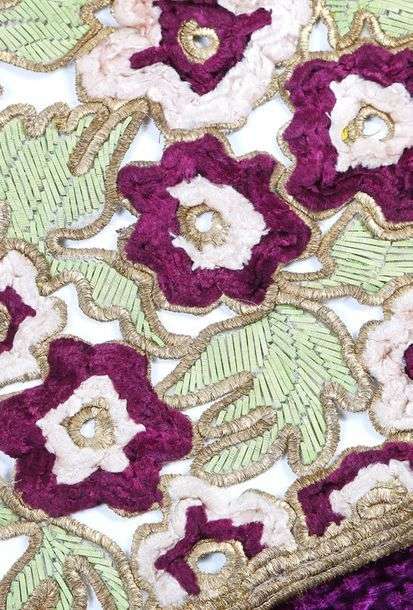 Motif d'angle sur velours violet, fleurs et feuilles, passementerie et velours. Fil métallique vert.