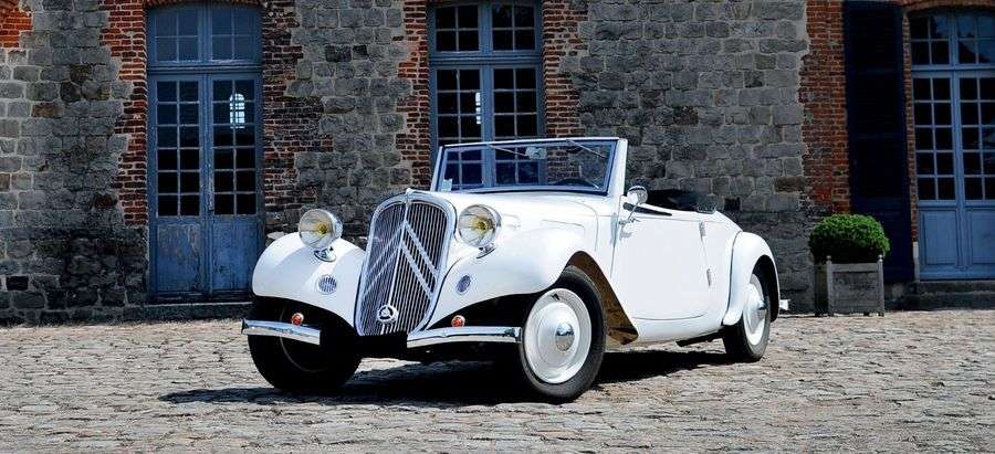 D’abord présentée en mars 1934 sous forme de berline devant les principaux concessionnaires Citroën, la 7 voit rapidement sa gamme s’étoffer avec deux autres versions, dénommées fauxcabriolet et roadster. Œuvre du sculpteur italien de génie Flaminio Bertoni, la Traction Avant connaitra un succès planétaire, mais malheureusement son géniteur André Citroën n’en verra pas le jour. Révolutionnaire lors de son lancement, la Traction va devenir un succès universel, prouvant le bien-fondé des choix d’André et de ses ingénieurs : traction avant, carrosserie monocoque, quatre roues indépendantes, le tout sous une ligne de carrosserie basse et élancée. Ses qualités n’ont fait que se confirmer au fil des ans et de son évolution, sur plus de 20 ans de production. Elle plaît d’emblée au public, grâce à l’excellente habitabilité que permet son absence de châssis, pour un prix qui reste raisonnable. La 7A, première version de la Traction, laisse place, au mois de juin, à la 7B qui adopte un moteur 1 529 cm3 développant 35 ch. Le cabriolet est équipé à l’arrière d’un spider accueillant deux personnes supplémentaires, c’est une voiture extrêmement séduisante car elle combine toutes les qualités routières de la Traction à une ligne très pure et un agrément d’utilisation supérieur à la berline, grâce à son habitacle au grand air. L’attrait du cabriolet Traction s’est traduit par la réalisation de répliques, ce qui rend les versions authentiques rares et recherchées. Comme celle qui nous intéresse aujourd’hui. D’après le recensement d’Olivier de Serres, on connait aujourd’hui environ 450 cabriolets Traction Avant tous modèles confondus survivant.