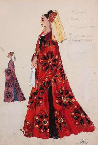 A. Dame en robe de parade pour la danse des coussins Aquarelle, encre et gouache sur trait de crayon et rehauts d'or sur papier Annotations et cachet de collection au dos 41,5 x 28 cm