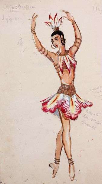 TATIANA GUÉORGUIÉVNA BRUNI (SAINT-PÉTERSBOURG 1902 - 2001) Ensemble de deux dessins: Belle indienne et Danseuse mulâtre de musique hall Gouache et aquarelle sur traits de crayons et rehauts d'or sur papier Cachet de collection au dos 42 x 23,5 cm et 42,5 x 30 cm