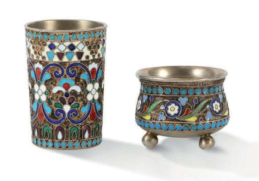 On y joint une SALIÈRE en argent à base tripode à décor d'émail polychrome cloisonné.