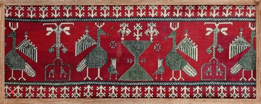 Elément de décor d'un tissu brodé en rouge et noir aux motifs d'oiseaux stylisés