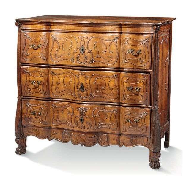 en chêne à façade légèrement galbée à décor d'ombilics et panier fleuri. Elle ouvre à trois tiroirs sur trois rangs et repose sur des pieds griffes.