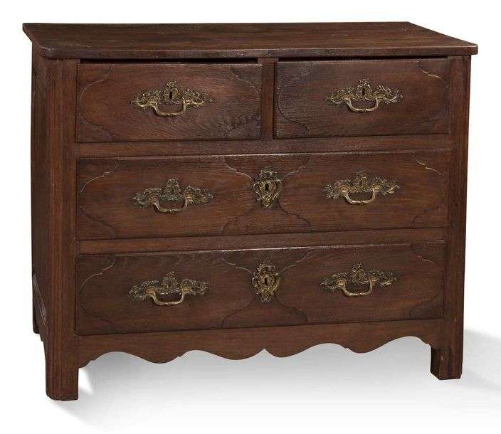 ø COMMODE de forme rectangulaire en chêne naturel mouluré. Elle ouvre en façade par quatre tiroirs sur trois rangs. XVIIIe siècle