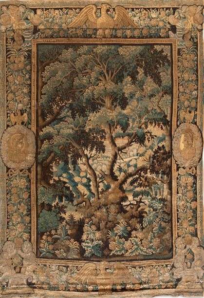 TAPISSERIE DES ATELIERS DE LA MARCHE (AUBUSSON, FRANCE), FIN DU XVIE, DÉBUT DU XVIIE SIÈCLE en laine et soie. Verdure animée d'une végétation, volatile et château en perspective au centre. Bordures à guirlandes de gerbes fleuries enrubannées entourées de deux casques et deux médaillons aux empereurs romains.