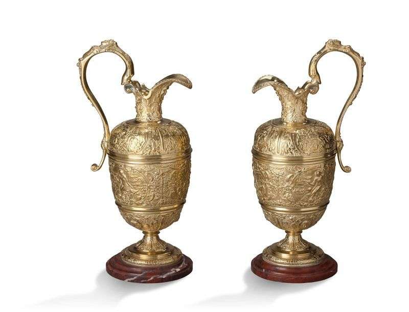 PAIRE D'AIGUIÈRES en bronze ciselé doré à décor renaissant compartimenté de masques, lambrequins et personnages dans des médaillons. Les anses ornées de bustes de femme stylisés. Contresocle en marbre rouge veiné blanc.