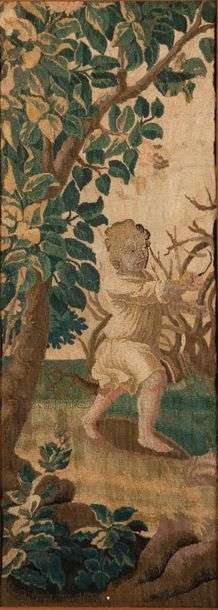 ø Fragment de tapisserie représentant un enfant dans un paysage de verdure Dans un cadre en bois naturel