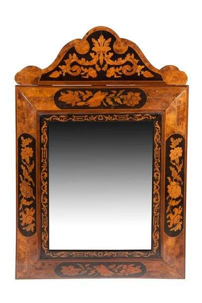 MIROIR BOMBÉ en placage d'érable et acajou en marqueterie de fleurs orné d'un fronton mouvementé Travail hollandais du XVIIe siècle