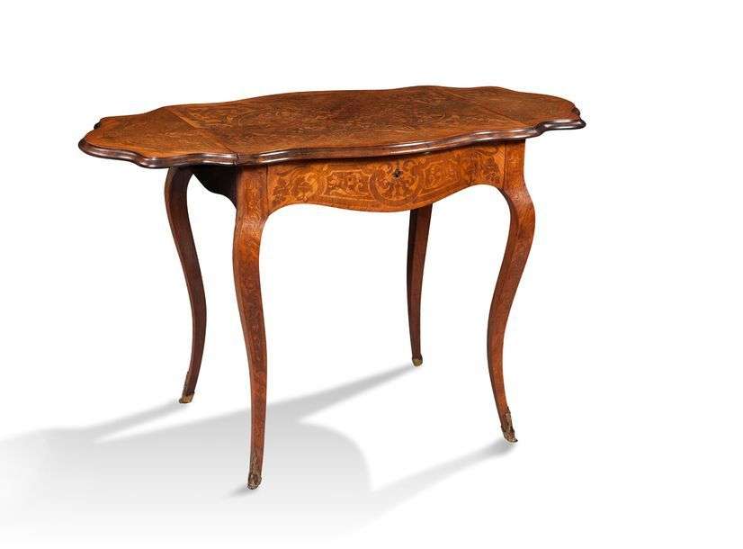 PETITE TABLE à volets de forme mouvementée en marqueterie à décor d'arabesques et de rinceaux feuillagés. Elle ouvre en ceinture par un tiroir. Quatre pieds sinueux terminés par des sabots de bronze. Travail hollandais du XIXe siècle. H: 71 - L: 115 - P: 61 cm