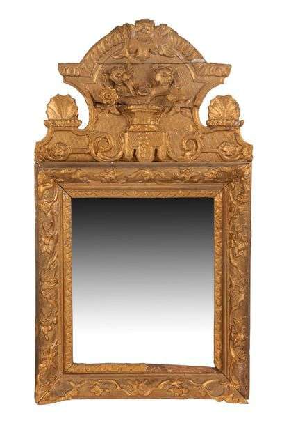PETIT MIROIR rectangulaire en bois mouluré doré sculpté à fronton à décor de coquilles et de bouquets fleuris. Style Louis XVI