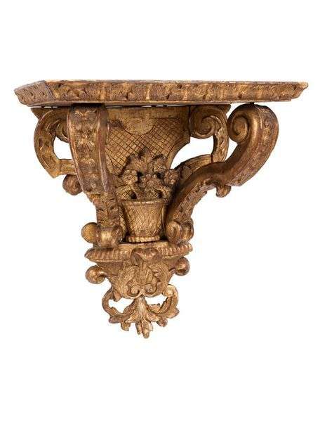 CONSOLE en bois ciselé doré supportée par deux bras en crosse ornés de feuilles d'acanthe, au centre un bouquet fleuri. Style Louis XVI.