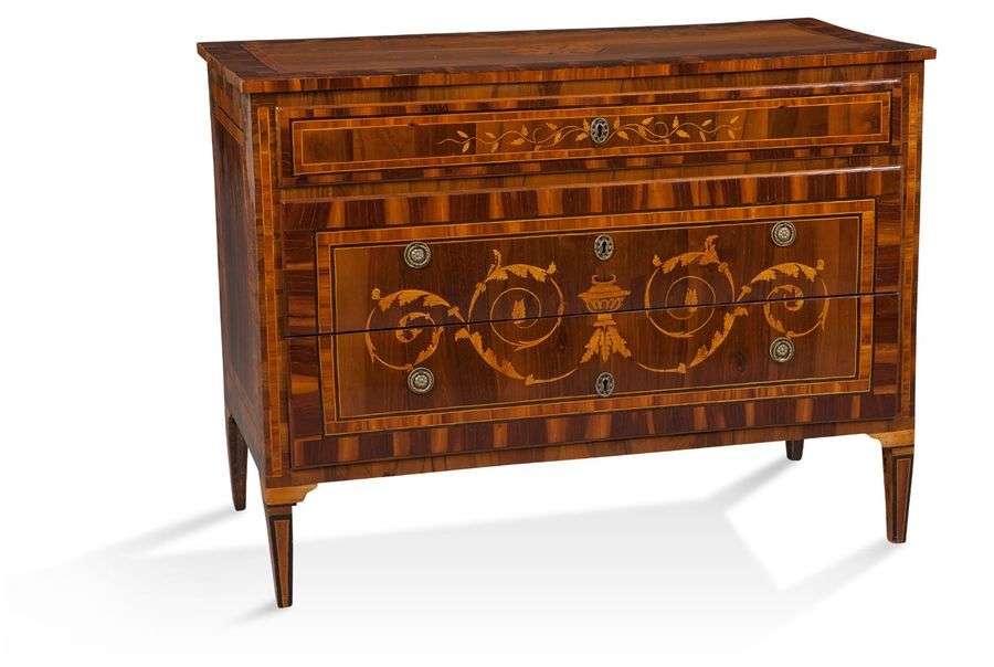 COMMODE en placage de bois divers à décor de rinceaux feuillagés ouvrant en façade sur trois tiroirs et reposant sur quatre pieds gaines. XVIIIe siècle
