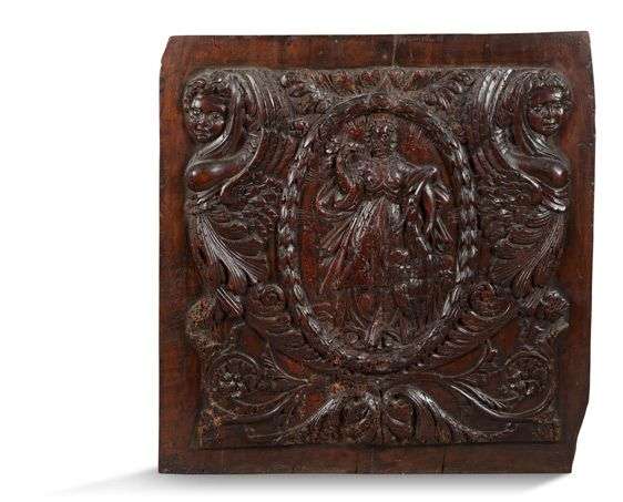 ELÉMENT en bois naturel mouluré sculpté représentant une sainte dans un médaillon entouré de sphinges Probablement XVIIe siècle