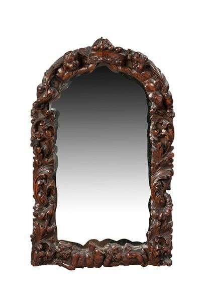 MIROIR en bois naturel mouluré sculpté de feuillages et d'angelots supportant une couronne XVIIe siècle