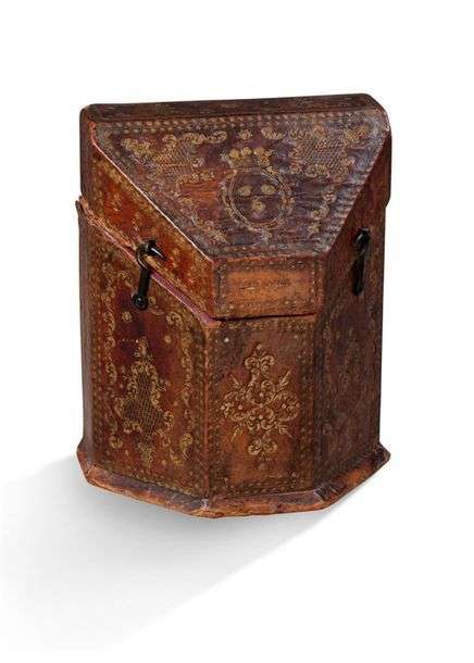 PETIT COFFRET DE VOYAGE à âme en bois recouvert de cuir doré aux petits fers orné d'une armoirie. XVIIIe siècle
