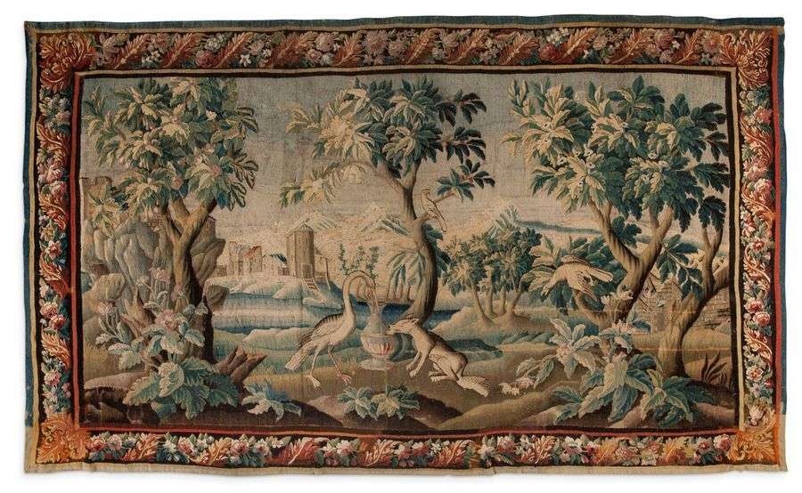 IMPORTANTE TAPISSERIE D'AUBUSSON, MILIEU XVIIIE Le Renard et La Cigogne Carton d'après jean Baptiste Pillement en laine et soie D'après la fable de Jean de La Fontaine Scène de verdure, trois arbres à riches végétations à volatile perché sur la droite, la cigogne et le renard encadrant un vase au centre, château et rivière en contrefond en perspective Bordure à feuillages enroulés en anneaux et torsades entourés de fleurs en polychromie. 404 x 257 cm Bon état général Belle polychromie