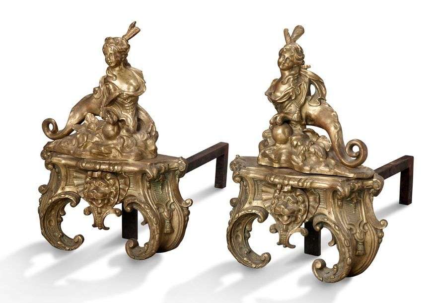 PAIRE DE CHENETS en bronze ciselé et doré à décor de figures anthropomorphes reposant sur des consoles à volutes ornées au centre de mufles de lion. XIXe siècle, style Régence