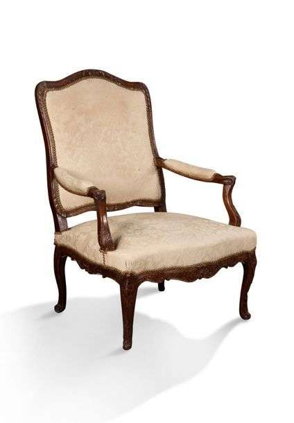 LARGE FAUTEUIL À DOSSIER À LA REINE en bois naturel mouluré sculpté d'ombilics, coquilles et acanthes. Ceinture chantournée reposant sur quatre pieds cambrés. Epoque Louis XV