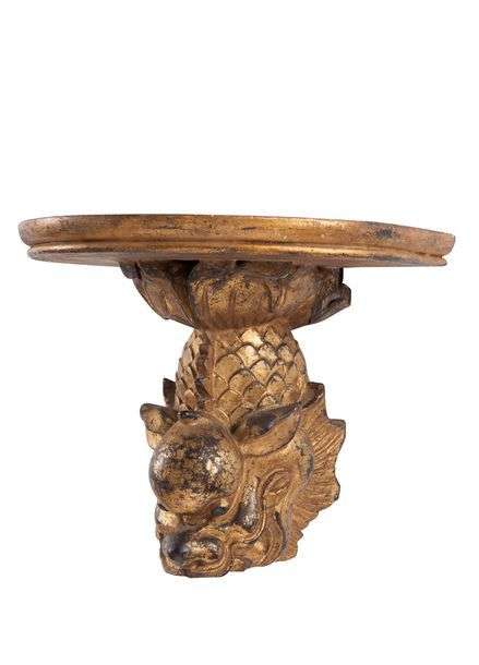 PAIRE DE CONSOLES MURALES en bois sculpté er doré figurant une tête de dragon stylisé XIXe siècle H: 17,5 cm Accidents, restaurations Et une paire de petites consoles murales en bois sculpté et doré à décor de volutes et de fleurs stylisées Travail de style H: 20 cm