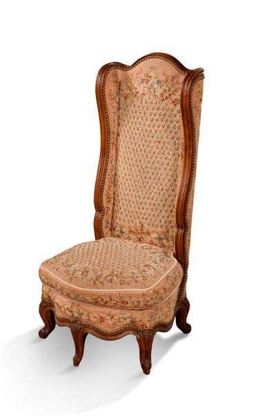 ø CHAISE PONTEUSE en bois naturel mouluré sculpté reposant sur cinq petits pieds à enroulement. XVIIIe siècle