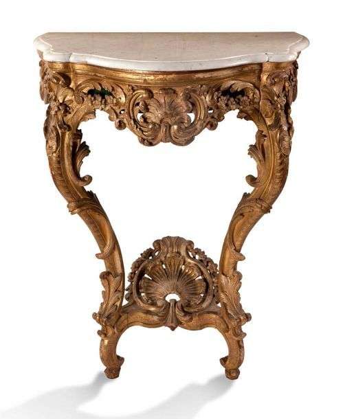 CONSOLE D'APPLIQUE FORMANT BASSIN en bois mouluré sculpté et doré. La ceinture à décor ajouré de coquilles, fleurettes et acanthes repose sur deux pieds cambrés réunis par une entretoise ornée d'une large palmette. Bassin en cuivre recouvert d'un plateau de marbre blanc Style Louis XV H: 92 - L: 72 - P: 47 cm