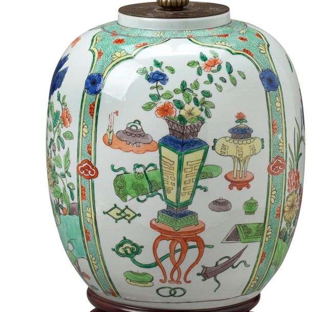 Vase en porcelaine aux émaux de la famille verte à décor de fleurs et d'ustensiles, monté en lampe XIXe siècle