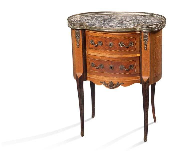 PAIRE DE TABLES TAMBOUR en placage de bois divers marqueté en feuilles ouvrant en façade par deux tiroirs. Montants plats reposant sur quatre pieds sinueux. Ornementation de bronzes ciselés dorés tels que: chutes, poignées de tirage, entrées de serrure et culots. Plateau de marbre gris veiné blanc orné d'une lingotière de laiton ajouré Style Transition H: 72 - L: 58 - P: 37 cm Soulèvements au placage