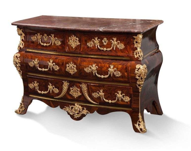 IMPORTANTE COMMODE TOMBEAU à moustaches en placage de palissandre de Rio marqueté en cubes. La façade galbée ouvre par quatre tiroirs sur trois rangs. Les montants à côtes pincées sont ornés de bronzes ciselés dorés. Ornementation de masques, de personnages en buste et motifs rocaille tels que poignées de tirage, entrées de serrure et culs de lampe. Quatre pieds sabot Epoque Régence Plateau de marbre rouge veiné blanc.