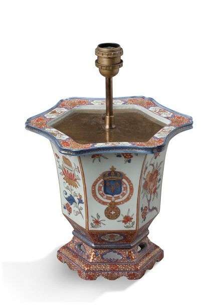Paire de vases montés en lampe en porcelaine de forme hexagonale à décor d'armoiries. Travail européen du XIXe siècle