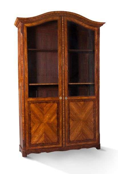 BIBLIOTHÈQUE en placage de bois de rose marqueté en ailes de papillons et compartimenté dans de fins filets de bois clairs. Elle ouvre par deux portes, la corniche mouvementée. Estampillée P. Roussel Epoque Transition H: 250 - L: 160 - P: 51 cm Pierre Roussel (1723-1782) Ébéniste, reçu maître le 21 août 1745. Très habile marqueteur, Roussel a laissé une production abondante, diverse et d'excellente qualité.