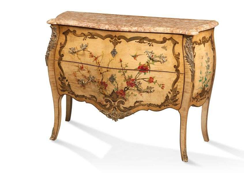 COMMODE GALBÉE à décor de fleurs et volatiles au vernis Martin polychrome sur fond jonquille à l'imitation de la laque de Chine. Elle ouvre en façade par deux tiroirs et repose sur quatre pieds cambrés. Ornementation de bronzes ciselés dorés tels que: chutes, poignées de tirage, entrées de serrure, culots et sabots. Plateau de marbre jaune veiné blanc. Style Louis XV
