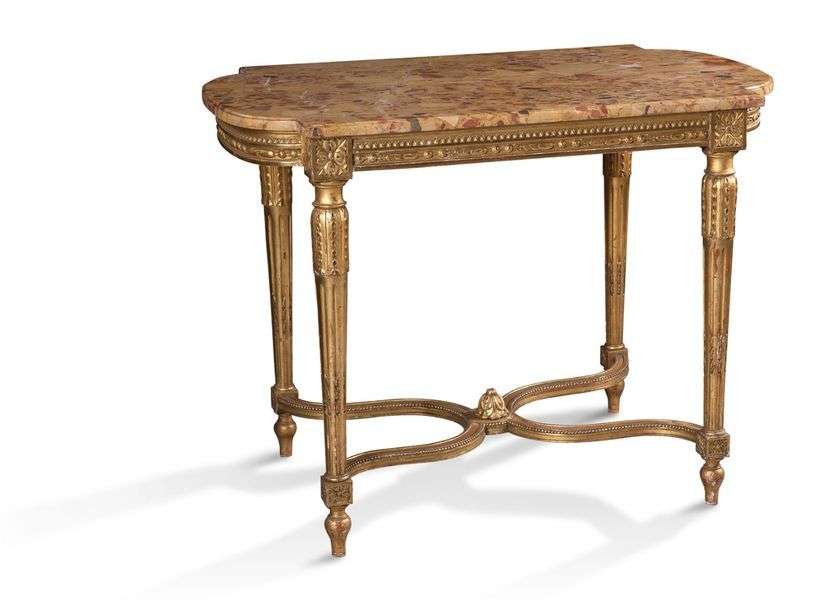 TABLE DE MILIEU en bois sculpté doré reposant sur quatre pieds balustre à cannelures et à asperges réunis par une entretoise en X. Plateau de marbre brèche d'Alep Style Louis XVI
