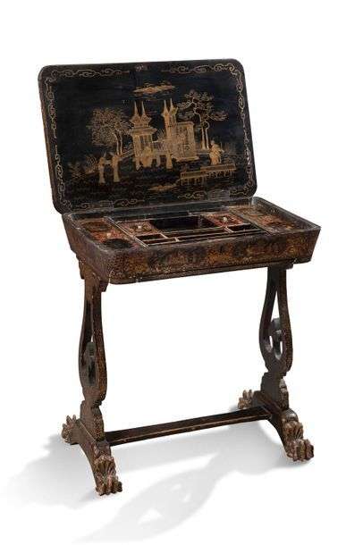 PETITE TRAVAILLEUSE en laque noire et or à décor de paysages chinois. Elle ouvre par un abattant découvrant des casiers et tiroirs. Elle repose sur un piètement ajouré terminé par quatre pieds griffe Epoque Napoléon III