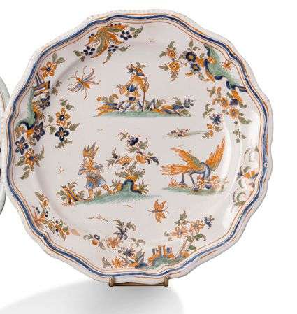 ASSIETTE en faïence à bordure contournée décorée en polychromie de deux grotesques et d'un oiseau fantastique encadrés de fleurs et de papillons. XVIIIe siècle