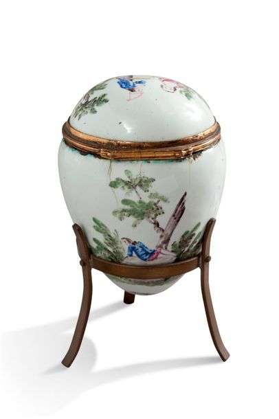ø *PETITE BOITE en forme d'oeuf à décor émaillé de scènes galantes dans des paysages. Monture en bronze ciselé doré. Collection Boin-taburet émail de Saxe. XIXe siècle