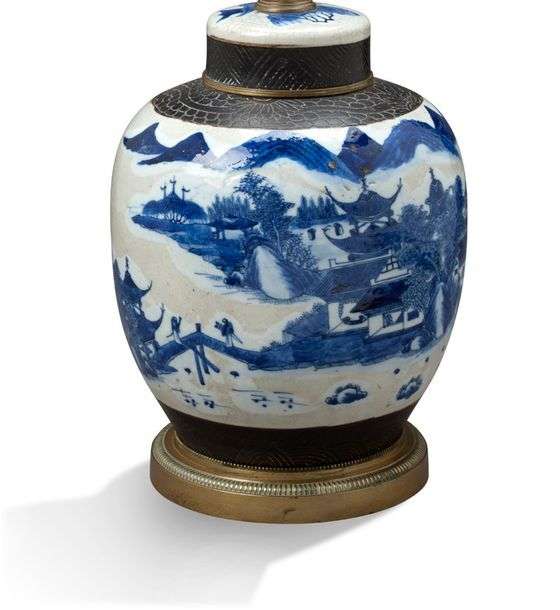 LAMPE en porcelaine bleu blanc à monture en bronze Chine , XIXe siècle