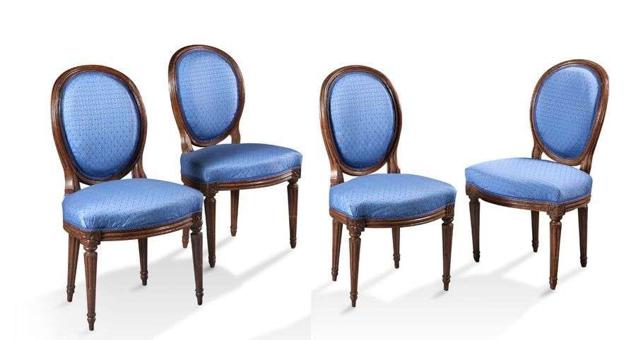 UNE SUITE DE QUATRE CHAISES À DOSSIER MÉDAILLONS en bois naturel mouluré sculpté. La ceinture arrondie est réunie par des dés de raccordement à rosace. elles reposent sur quatre pieds fuselés à cannelures rudentées. Epoque: Louis XVI H: 87 L: 49 P: 43 cm