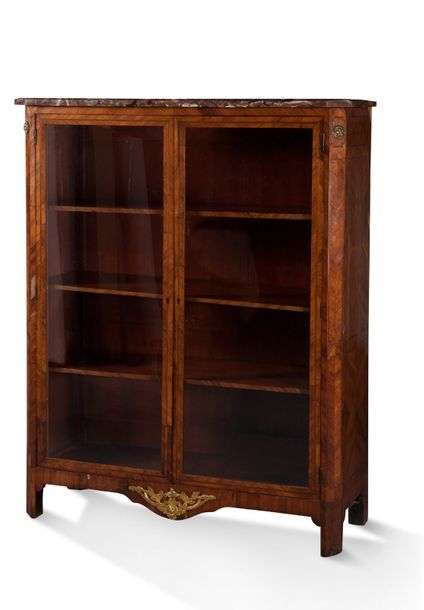 BIBLIOTHÈQUE VITRINE en placage de bois de rose ouvrant en façade par deux portes. Montants à pans coupés ornés de rosaces en bronze ciselé doré. Porte une estampille et JME Marque de Jurande. Plateau de marbre du Languedoc. XVIIIe siècle Manques au placage H: 146 - L: 115 - P: 43 cm