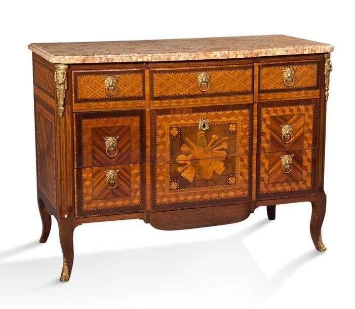 IMPORTANTE COMMODE À LÉGER RESSAUT en placage de satiné, bois de rose et bois de violette marqueté en cubes à fond perdu et losanges dans des encadrements de bois verdi et bois teinté noir. La façade ouvre par cinq tiroirs sur trois rangs, elle est ornée d'une composition aux instruments de musique. Les montants arrondis reposent sur quatre pieds cambrés. Ornementation de bronzes ciselés dorés à décor de festons et de mufles, de boucs tels que: chutes et poignées de tirage. Plateau de marbre jaune veiné rouge (fente) Epoque Transition
