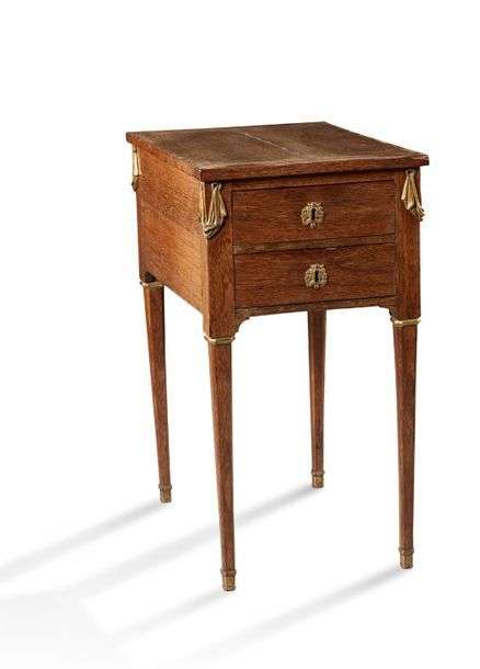 PETITE TABLE RECTANGULAIRE en placage d'acajou blond. Elle ouvre en façade par deux tiroirs et repose sur quatre pieds gaine terminés par des petits sabots de bronze. Les écoinçons ornés de motifs de draperie. Fin du XVIIIe siècle Style Louis XVI