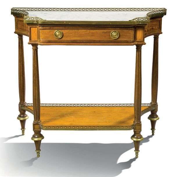 CONSOLE DESSERTE en acajou et citronnier moiré de forme trapézoidale. La ceinture ouvre par un tiroir. Elle repose sur des pieds cannelés réunis par une tablette d'entretoise à galerie. Plateau de marbre blanc encastré orné d'une lingotière ajourée. XIXe siècle H: 93 - L: 104,5 - P: 46,5 cm