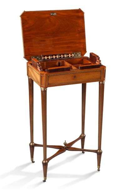 PETITE TRAVAILLEUSE en placage d'acajou flammé. Le plateau s'ouvre et présente un plateau à quatre casiers amovible découvrant quatre autres casiers et quatre petits tiroirs dissimulés. Elle repose sur quatre pieds à cannelures feintes de laiton réunis par une entretoise en X. Napoléon III Porte une trace d'estampille. XIXe siècle