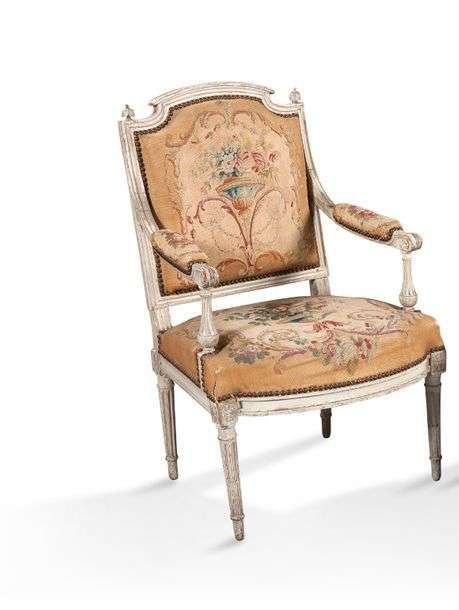 en bois sculpté rechampi gris, les épaulements à grattoirs soulignés de panaches | supports d'accotoirs balustres à cannelures | dés à rosaces | pieds fuselés à cannelures ou cannelures rudentées.