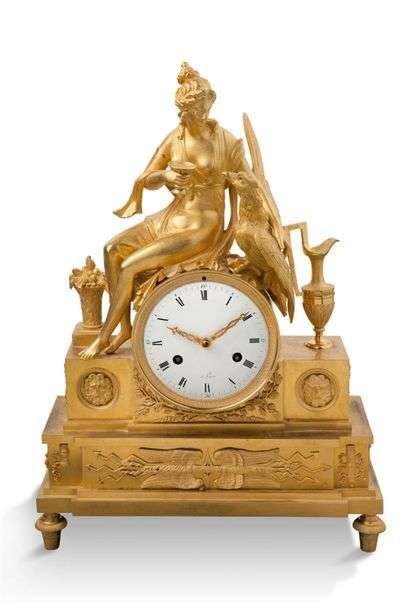 PENDULE en bronze ciselé doré représentant Hébé et l'aigle de Jupiter. Le cadran en émail présente les heures en chiffres romains et les minutes en chiffres arabes. Elle repose sur un socle rectangulaire orné de masques dans des médaillons. Contresocle à décor appliqué d'ailes affrontées. Elle repose sur quatre pieds toupie. XIXe siècle
