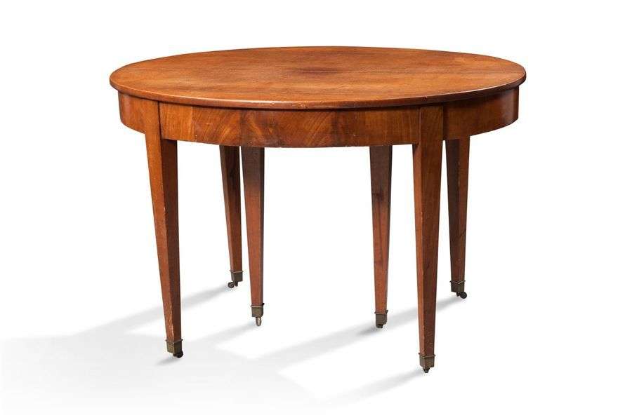 ø TABLE OVALE en acajou reposant sur six pieds gaine terminés par des roulettes. Style Louis XVI